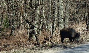 Самка с поросятами перегородила им проход.