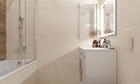 Ну и конечно просторный санузел с дизайнерской плиткой и мебелью в ванной .